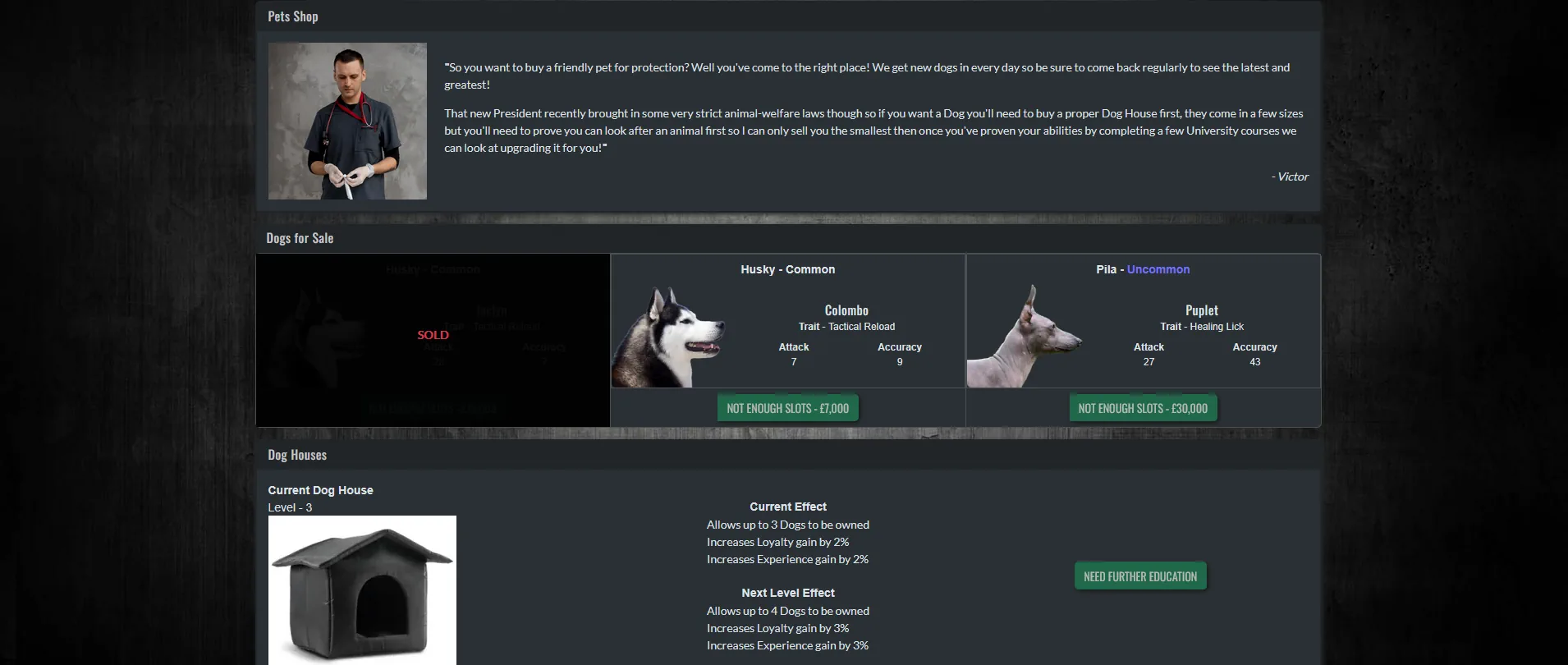 Pet's come in a variety of rarities and breeds, and can be fed to increase Loyalty and trained to improve their stats.